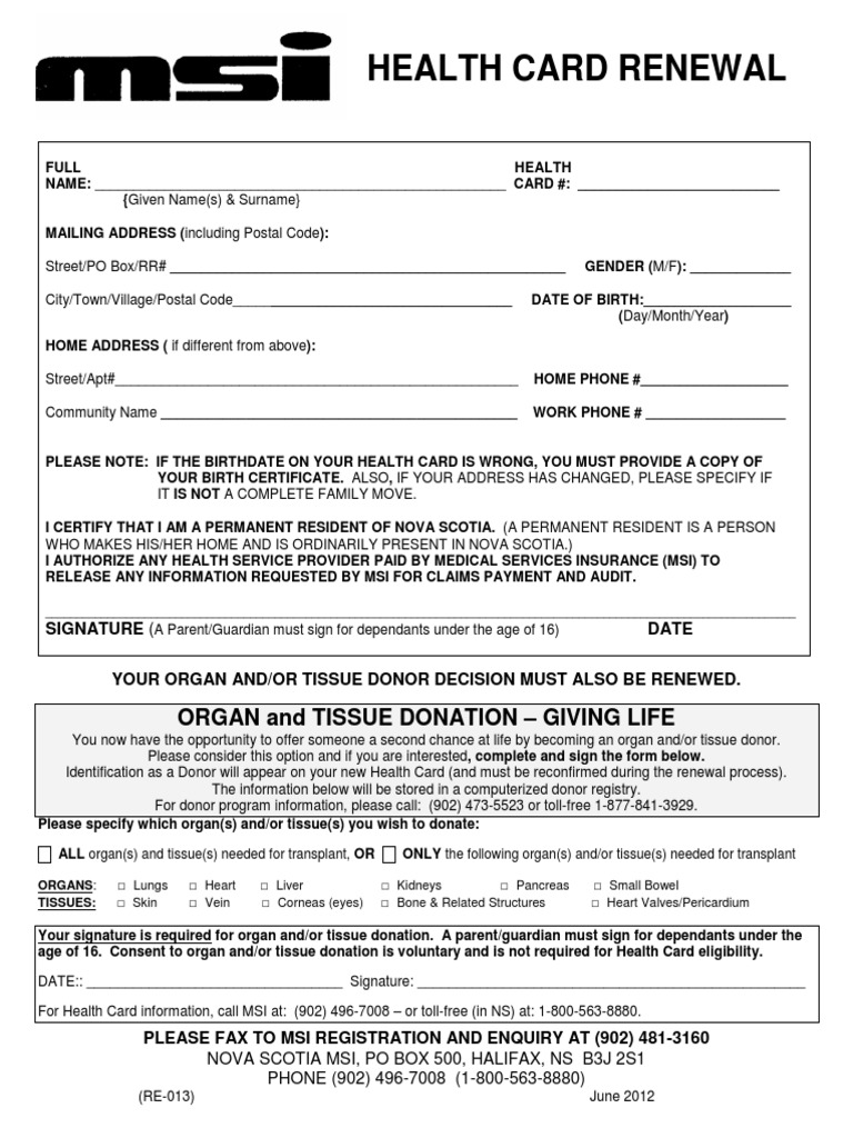 Forms health card renewal form. Health cards must be presented to health care providers. Identification as a donor will appear on your new health card (and must be reconfirmed during.